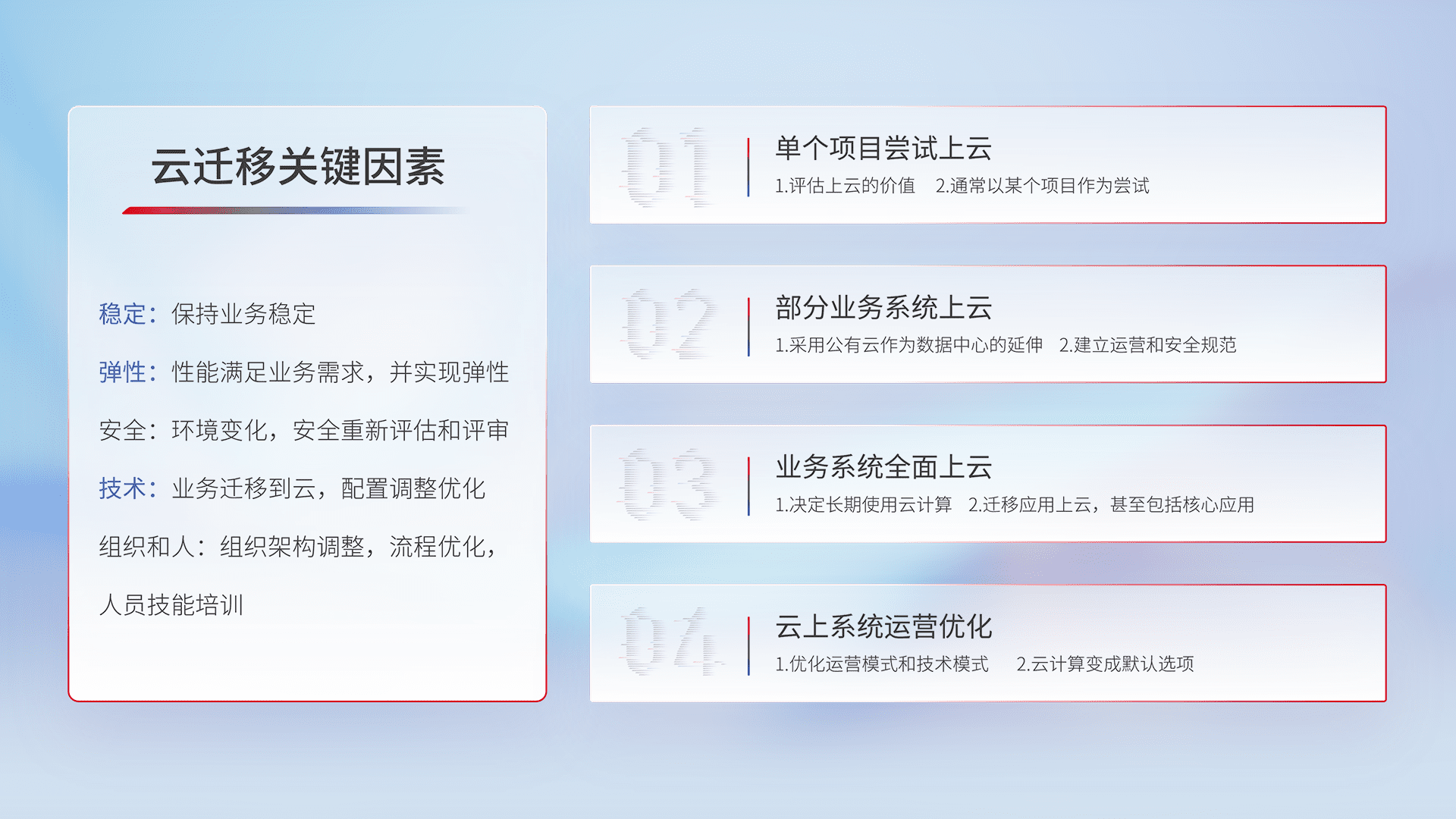 结合实际业务,,,从规划设计、、、、云平台选型、、、、云原生改造、、、、数据迁移、、、、集成交付,,,迁移全过程为客户识别最佳上云路径,,做好风险识别管理,,,,设计网络架构、、、、身份权限、、、、安全审计合规、、、、操作审计、、、日志审计、、、、监控告警策略、、、、多站点容灾设计等,,对云上基础设施进行整体规划,,,提升IT治理水平,,以满足弹性、、、、高可用、、高性能的需求。。。
