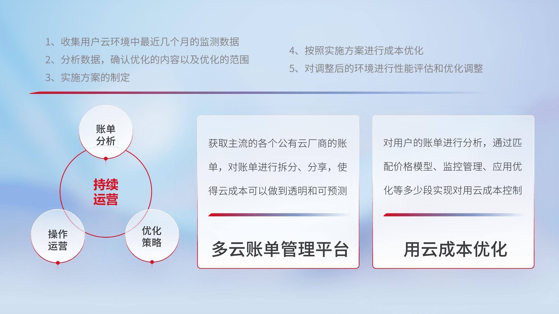通过多云纳管,,以统一的资源数据模型把客户的云资源进行抽象和封装,,进而实现对多云资源的统一操作,,保障云资源管理的可靠性、、、稳定性与可用性。。。量身定制化运维内容,,,,配置、、、开发运维、、、、补丁管理、、、、备份、、监控、、、认证和访问管理、、审计和日常巡检等,,,保障在用云过程中的可靠度,,,稳定度以及高可用率。。。